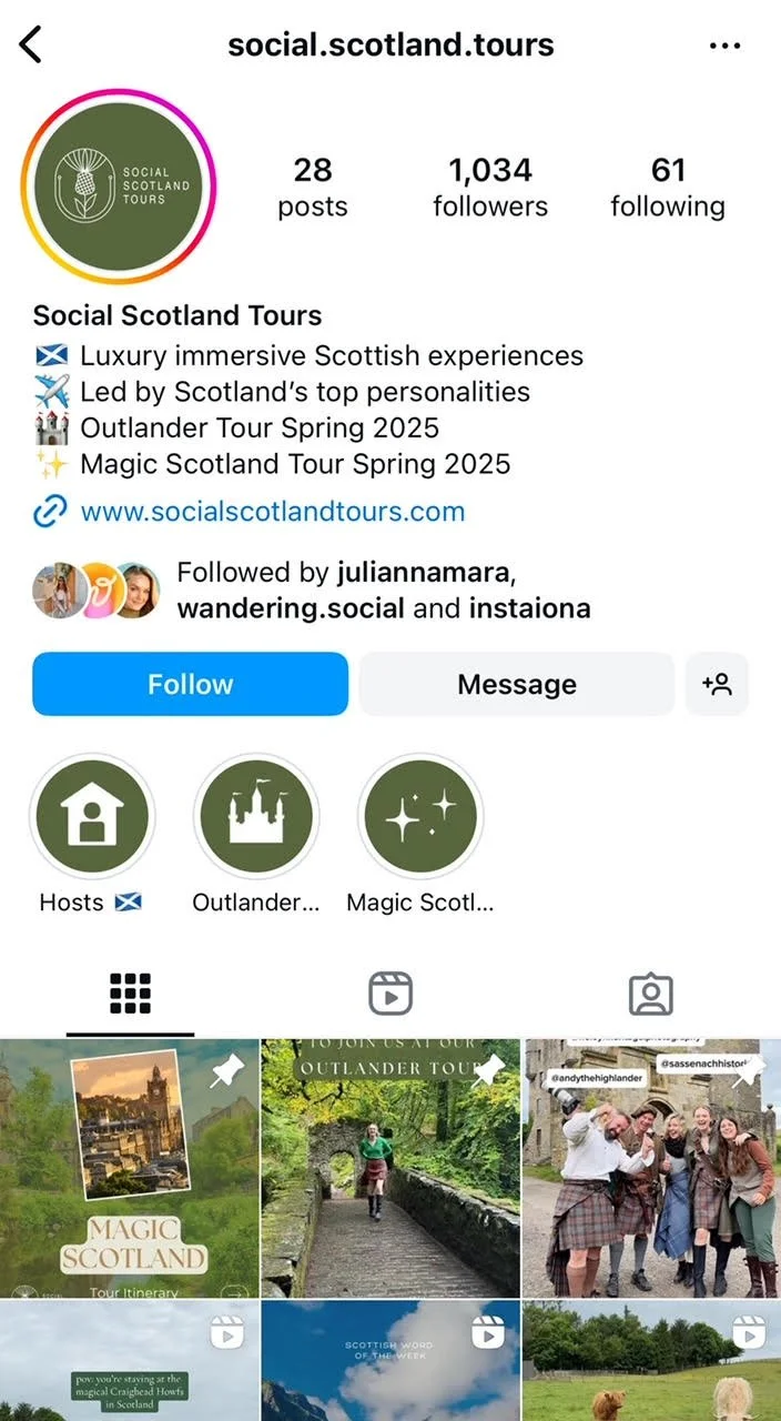 The company was looking to differentiate itself from typical tourist offerings by showcasing immersive experiences led by Scotland's best local personalities. We developed a social media strategy, defined content pillars, established measurable goals and developed a content plan which served as the foundation for the on-going content creation work. We now manage Social Scotland Tour's social media accounts, creating and editing video content and managing the publishing.